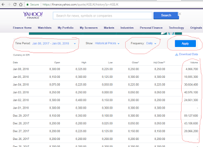 Pada menu diatas di-sebelah 'search' pilih kode saham yang ingin anda cari data volume transaksinya. Misalnya anda ingin memilih PT Astra International, maka ketikkan kode sahamnya, yaitu ASII.
