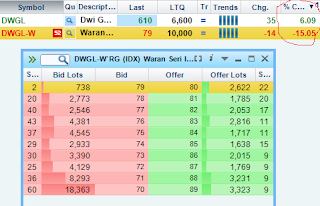 Waran juga tidak se-likuid saham induknya. Walaupun ada beberapa waran yang juga masih lumayan likuid, seperti contoh DWGL-W diatas. Anda perhatikan, antriannya cukup banyak.