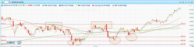 Contohnya adalah chart BBRI diatas. Anda bisa perhatikan bahwa BBRI memiliki fluktuatif harga yang bagus (tidak sideways dalam waktu lama), di mana banyak titik harga yang bisa dijadikan sebagai acuan support (lingkaran) dan resisten (persegi) untuk memperoleh profit baik dari trading harian ataupun mingguan.