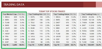 Data diatas saya ambil di situs IDX, yaitu 10 saham yang punya top market cap. Saham2 inilah yang bisa dikatakan sebagai 'saham juara' yang bisa menjadi penggerak IHSG.