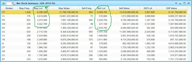 Pada tabel net buy diatas, hanya YP yang melakukan akmulasi beli hingga 9 juta lot. Tapi itupun YP juga distribusi sebanyak 5 juta lot lebih.