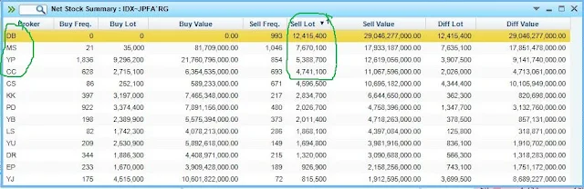 Bisa anda lihat diatas, ternyata penjual saham JPFA yang paling besar adalah dari sekuritas DB, MS dan YP. Tentang kode2 sekuritas anda bisa tanya Mbah Google.