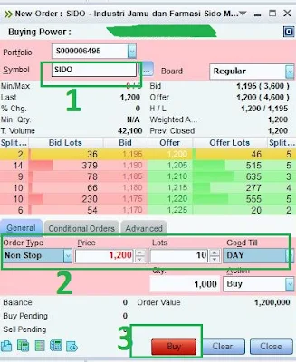 Untuk bisa membeli saham Sido Muncul, ketikkan kode sahamnya yaitu: SIDO (nomor 1). Lalu ketikkan juga jumlah lot dan harga yang ingin anda beli (nomor 2 dan 3).