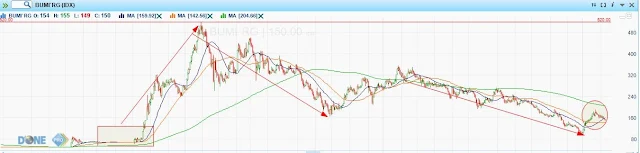 Kembali lagi, pada grafik BUMI diatas bahkan selama beberapa tahun, BUMI nyaris balik lagi ke gocap, ke harga 80-100... Walaupun akhirnya BUMI berhasil naik sampai 180. Tapi tetap saja BUMI masih jauuuh dari harga awalnya.