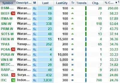 Saham2 yang masuk dalam top gainer, adalah saham2 yang bisa naik puluhan persen dalam waktu singkat (termasuk waran). Anda bisa lihat saham2 diatas seperti YPAS yang naik 35,76% atau saham ITIC yang naik 24,76%.