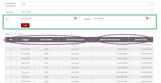 Pada contoh diatas, saya mencoba menampilkan perusahaan2 yang melakukan stock split selama 1 tahun mulai 1 Januari 2019 - 31 Desember 2019, dan muncullah data seluruh perusahaan yang melakukan stock split di periode tersebut (lihat tanda lingkaran ungu).