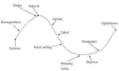 Ketika harga saham naik terus, akan muncul euforia. Di satu sisi mulai muncullah risiko. Setelah harga saham turun, mulailah terjadi cemas, takut, hingga panic selling dan depresi.