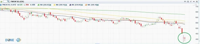 Salah satu contoh yang ingin saya paparkan di pos ini adalah saham PWON, di mana saham ini biasanya harganya berkisar antara 600-700, namun karena market sedang strong bearish (saat wabah Virus Corona), saham PWON turun terus sampai dibawah 400 per saham. Anda bisa perhatikan chart PWON berikut: