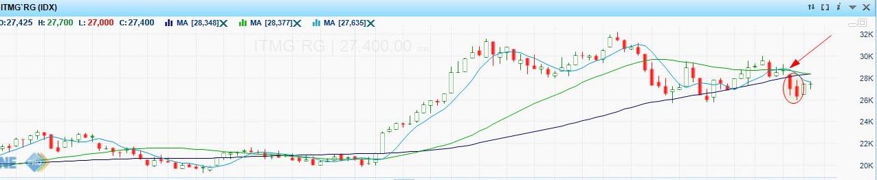 ITMG yang masih berada di harga 28.275 saat cum date 2 April naik secara peralahan sampai 28.650 menjelang penutupan Bursa. Namun keesokan harinya (ex date), ITMG langsung dibuka anjlok ke 28.300 dan dalam hitungan menit turun sampai 26.500. Dan sehari setelah ex date, ITMG turun lagi sampai 26.000, walaupun hari berikutnya mampu naik lagi. Perhatikan grafik ITMG dibawah: