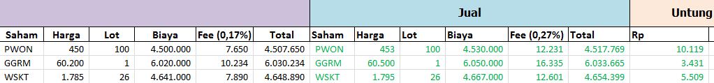 Demikian juga ketika anda membeli saham GGRM. Ketika anda menjual GGRM di 60.225 (beli di 60.200) anda belum bisa cuan. Ketika anda beli WSKT di 1.785 dan jual di 1.790 anda juga belum bisa cuan.