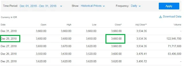 Setelah itu, anda bisa ambil harga closing yang per 28 Desember. Hal ini karena tanggal 31 Desember adalah hari libur Bursa saham, sehingga harga saham tahunan adalah tanggal 28 Desember (Atau kalau tanggal 29 dan 30 Desember adalah hari Senin-Jumat, maka anda bisa ambil harga tahunannya tanggal 29 atau 30 Desember).