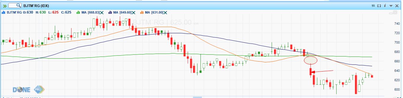 Dividend trap BJTM. Saham BJTM naik tinggi sebelumnya. Tapi setelah ada pengumuman dividen dan pada saat tanggal ex date, BJTM langsung jatuh dan membentuk gap down yang cukup lebar (tanda lingkaran). Fyi, di BJTM ini seringkali terjadi dividend trap.