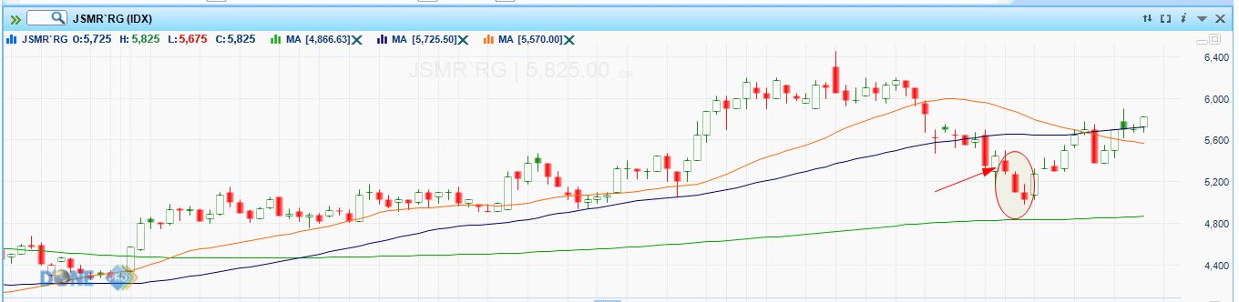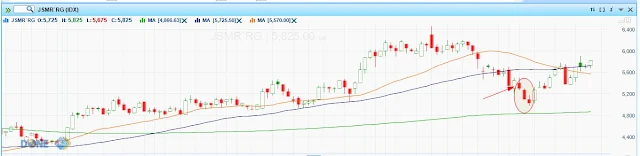 Justru JSMR harganya bisa anda lihat, koreksi terus menjelang pembagian dividen. Namun, saat tanggal ex date dividen, JSMR turun lebih drastis dan penurunan ini terjadi sampai tiga hari berturut-turut, sebelum akhirnya rebound.