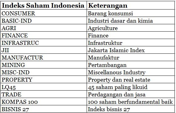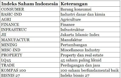 Di Indonesia, pergerakan chart IHSG memang paling sering dijadikan acuan untuk memprediksi arah pasar pada hari berikutnya. Namun, tahukah Anda bahwa di Indonesia sendiri, indeks saham tidak hanya terdiri dari IHSG, namun terdiri dari banyak indeks2 lainnya. Sama seperti Amerika, Bursa saham utamanya adalah NYSE, namun di Amerika terdapat indeks yang "dipecah-pecah", seperti Dow Jones, SP500, Nasdaq dan lain2. Berikut adalah indeks di bursa saham Indonesia.