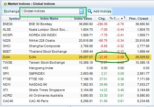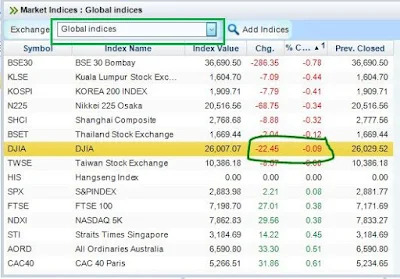 Disitu anda bisa melihat kenaikan / penurunan bursa-bursa saham dunia seperti indeks DJIA, S&P index, Nasdaq yang sering dijadikan acuan dunia. Anda bisa lihat indeks2 saham Asia seperti Strait Times, Shanghai Composite dan lain2.