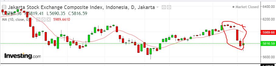 Perhatikan yang saya beri tanda lingkaran merah. Saat itu sedang terjadi guncangan krisis finansial di Turki, di mana mata uang Turki yaitu Lira juga terus melemah terhadap USD. Semakin drop IHSG, maka kondisi ini semakin menimbulkan panic selling alias jual besar-besaran.