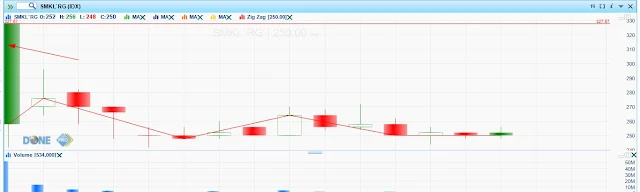 Saham SMKL di harga pertama IPO (tanda panah) memiliki pergerakan kenaikan yang sangat cepat, di mana SMKL bergerak dari harga 258 sampai ke harga 328. Namun keesokan hari, SMKL dijatuhkan ke harga 276, dan setelah itu SMKL cenderung sideways di harga 250 sampai beberapa minggu dengan volume transaksi yang kecil.
