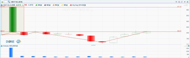 Anda bisa perhatikan pola IPO saham HDIT yang kurang lebih sama dengan pola2 saham IPO lainnya. Di hari pertama, HDIT diangkat tinggi dari harga 800 sampai 980, namun setelah itu di hari2 berikutnya sahamnya anjlok, cenderung bergerak sideways di kisaran 810 dengan volume transaksi yang kecil.