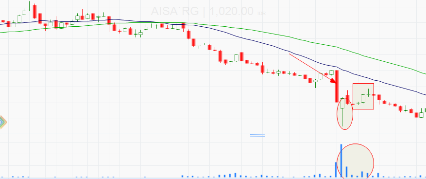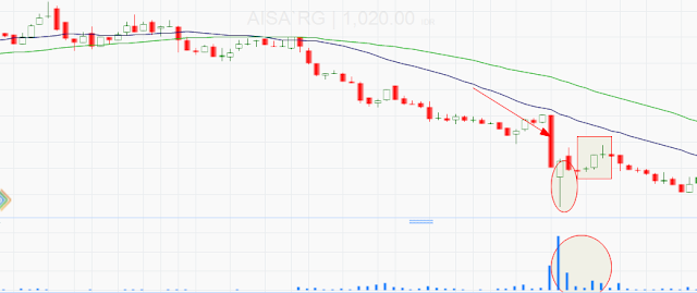 Harga saham AISA langsung turun 24% dalam sehari (perhatikan tanda panah) dan ditutup di harga 1.205. Keesokan hari, AISA langsung turun lagi sampai 905 (perhatikan tanda lingkaran), namun AISA dengan cepat berbalik naik sampai menyentuh 1.250. AISA kemudian dengan cepat koreksi lagi dan ditutup di harga 1.135.