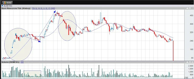 Saham BUMI ketika akan melakukan konversi utang ke saham (tepatnya saat masih menjadi rumor karena belum disetujui kreditor) harga sahamnya langsung diangkat tinggi oleh bandar ( perhatikan tanda lingkaran pertama). Kemudian saat beberapa kreditor sudah menyetujui konversi tersebut, harga saham langsung "dibanting" perlahan tapi pasti (volume mulai berkurang drastis). BUMI kembali naik drastis karena adanya sentimen harga batu bara yang rebound cepat.