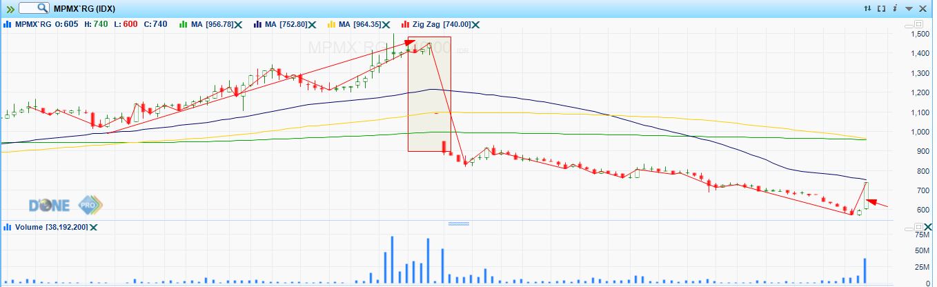 Saham MPMX sempat naik 23,74% dalam sehari (lihat tanda panah di candle terakhir). Sehingga, saya mendapat beberapa pertanyaan dari trader: Apa MPMX sudah waktunya beli lagi? Apakah MPMX bisa buat trading jangka pendek? Apakah MPMX bisa balik ke 1.000 karena terakhir volumenya besar?