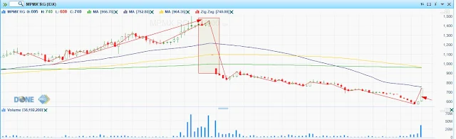 Pasca dividend trap (lihat tanda persegi) dari harga 1.400-an. MPMX terus anjlok selama beberapa bulan, dan harganya masih belum kembali ke harga awal lagi (harga 1.400 sebelum jatuh). Bahkan MPMX cenderung turun terus hingga di level 600-700.