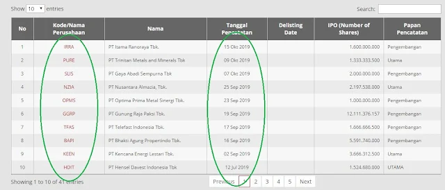 Setiap saham yang baru listing di pasar saham, situs IDX akan meng-updatenya dengan data2 emiten terbaru. Termasuk kode saham dan nama perusahaan serta tanggal pencatatannya. Dan anda bisa mencari saham2 IPO ini mulai dari yang terbaru sampai 4 tahun kebelakang (di situs IDX).