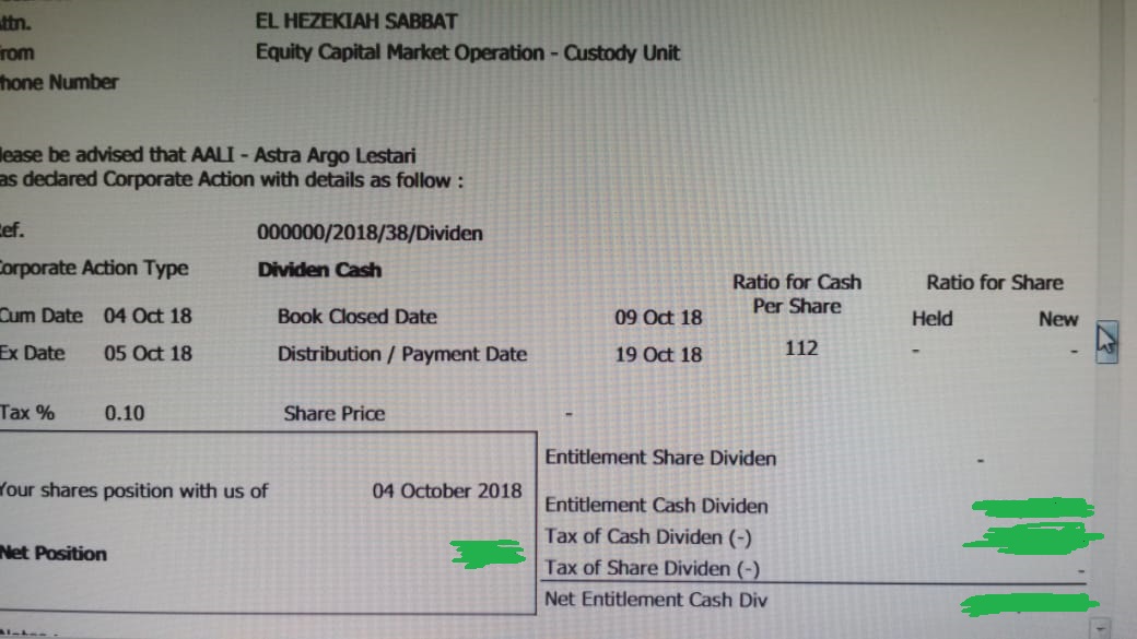 Saya pernah mengalami sendiri ketika saya memutuskan untuk beli saham AALI, karena AALI akan membagikan dividen. Setelah melakukan analisa2 lebih lanjut, saya memutuskan untuk buy AALI di harga 12.200. Perhatikan rincian transaksi AALI saya dan dividen AALI yang pernah saya terima.